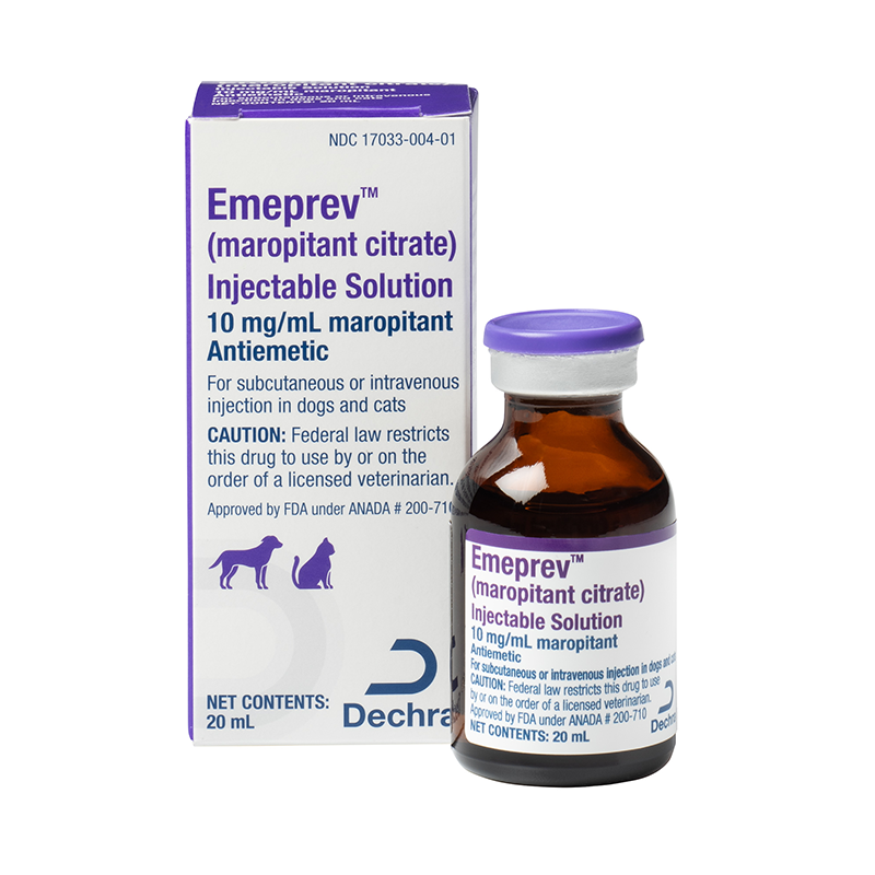 Emeprev™ Injectable Solution is indicated for the prevention and treatment of acute vomiting in dogs and for the treatment of vomiting in cats. Each mL of solution contains 10 mg maropitant (as maropitant citrate), 63 mg sulfobutylether-β-cyclodextrin, 11.1 mg benzyl alcohol (preservative), and water for injection.¹ Emeprev™ is supplied in a 20 mL amber glass vial.